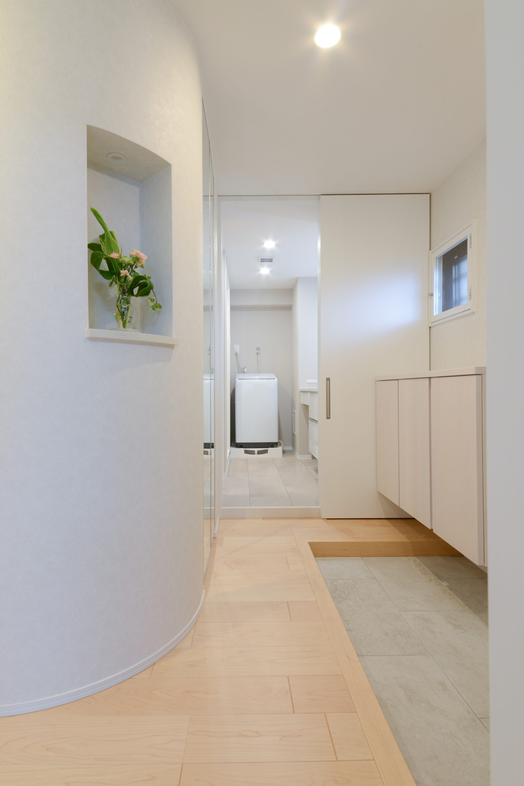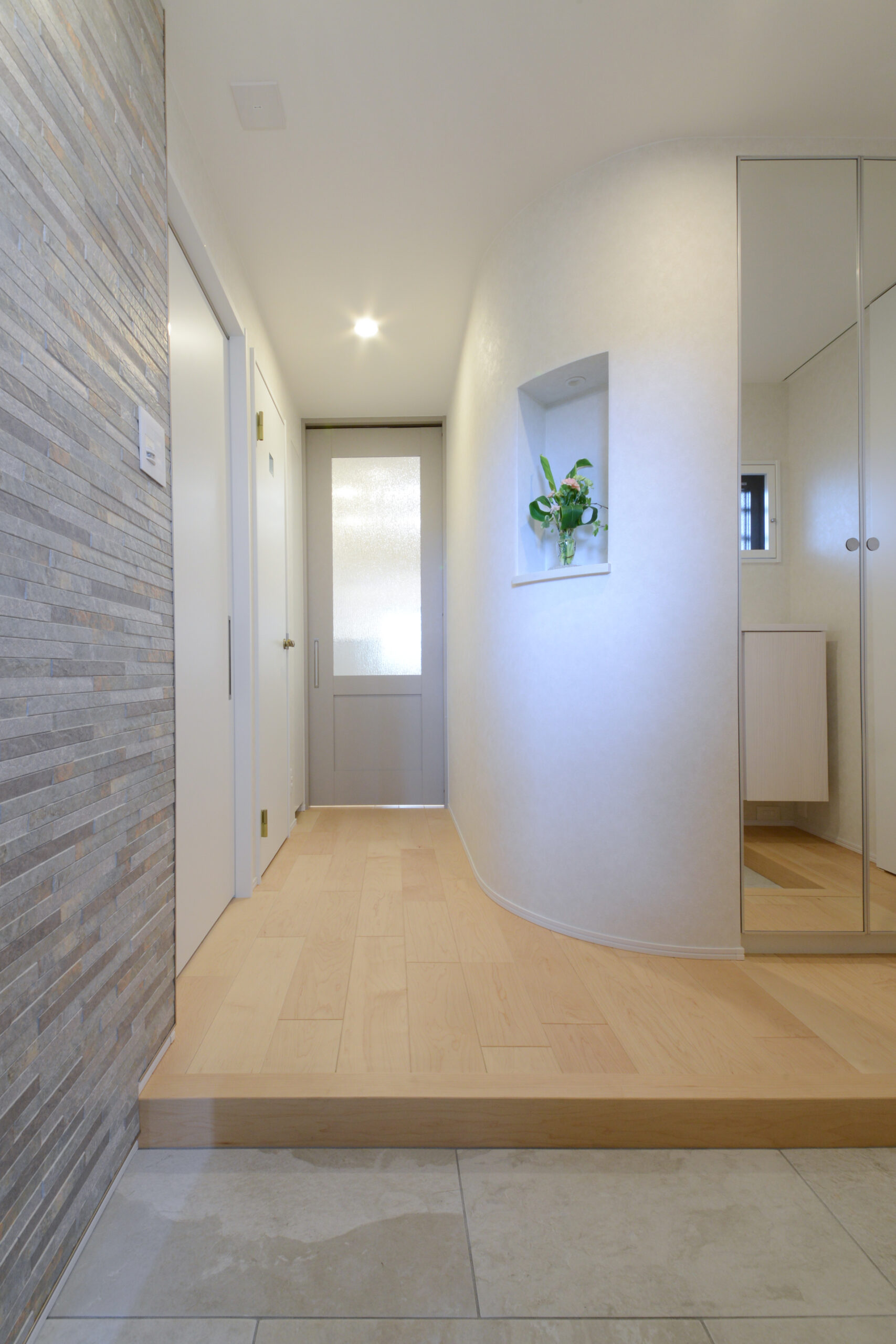 キッチンのパイプスペースを利用したアーチと玄関のR壁がお気に入りです