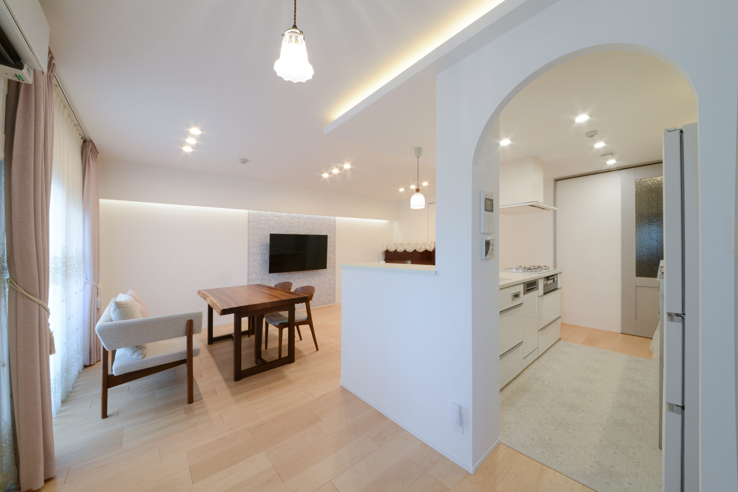 キッチンのパイプスペースを利用したアーチと玄関のR壁がお気に入りです。