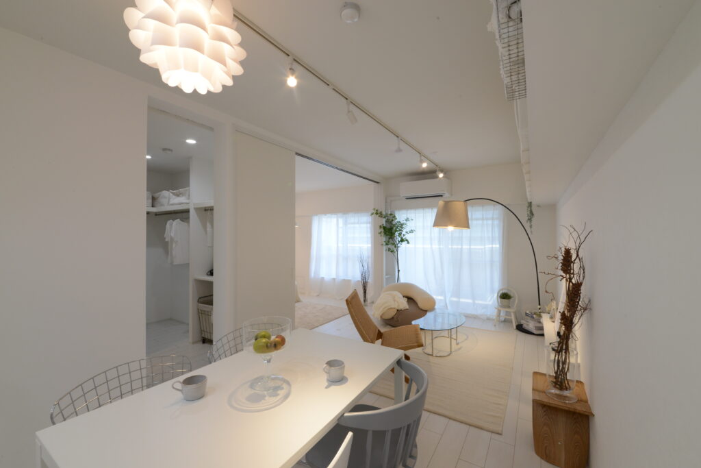 3LDKを1LDKにした大空間。キッチンのペンダントライトやこだわりのある木目調のリビングドアがモダンでおしゃれな雰囲気...