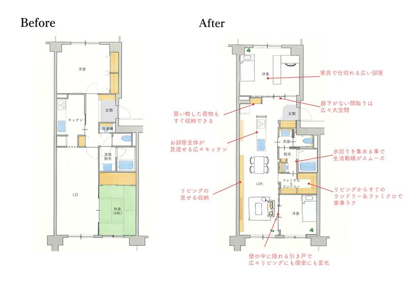 「明るく暮しやすい」をテーマにしたマンションリノベーション。間取りを考える上でのもう一つのテーマは無駄をなくしてシンプル...