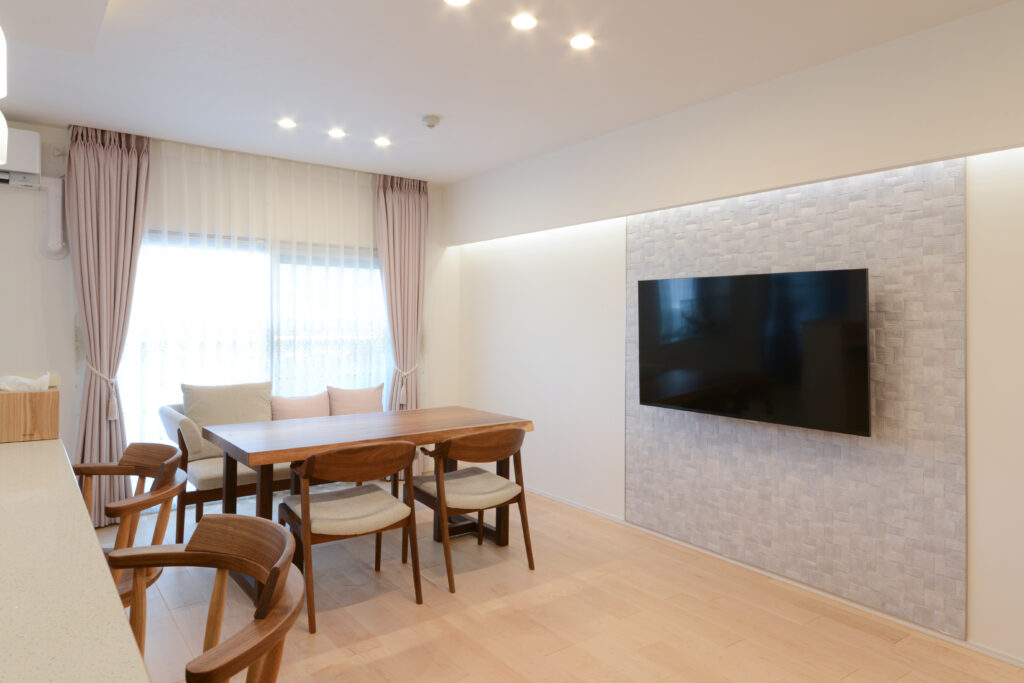 やわらかさを感じさせる乱積み調の壁材と雰囲気のある間接照明でリビングが一気にお洒落な空間に。 TVの配線を隠すことで、生活感を抑えました。