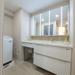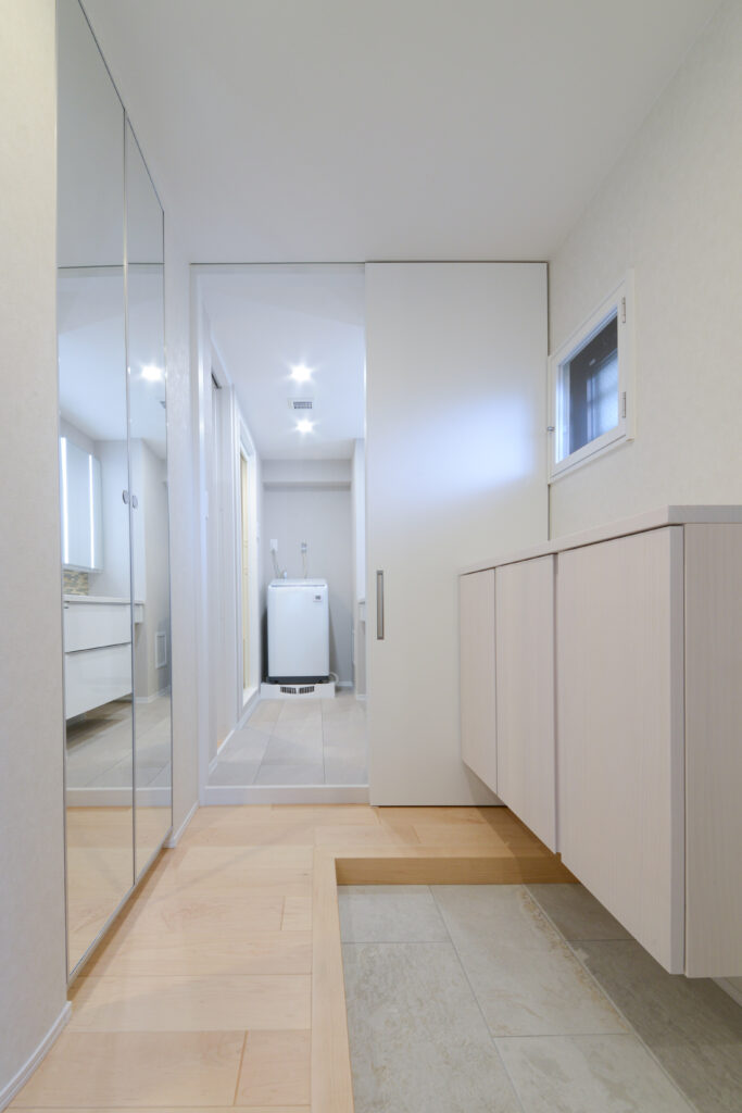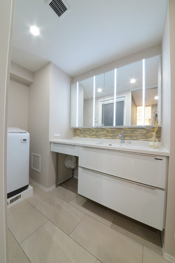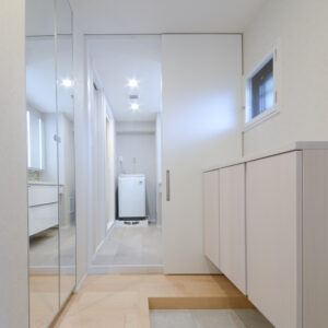 鏡の裏にもたっぷり収納◎ 玄関から水回りへもスムーズな動線で、身だしなみと家事が一気に整う設計に!