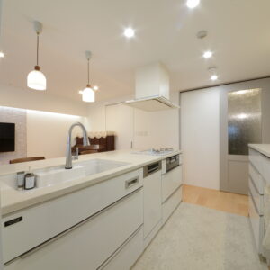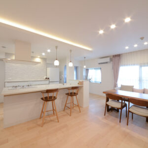 間接照明×ダウンライトでホテルライクなLDK。 キッチンに立ちながら家族の様子も見渡せる開放的な空間に。