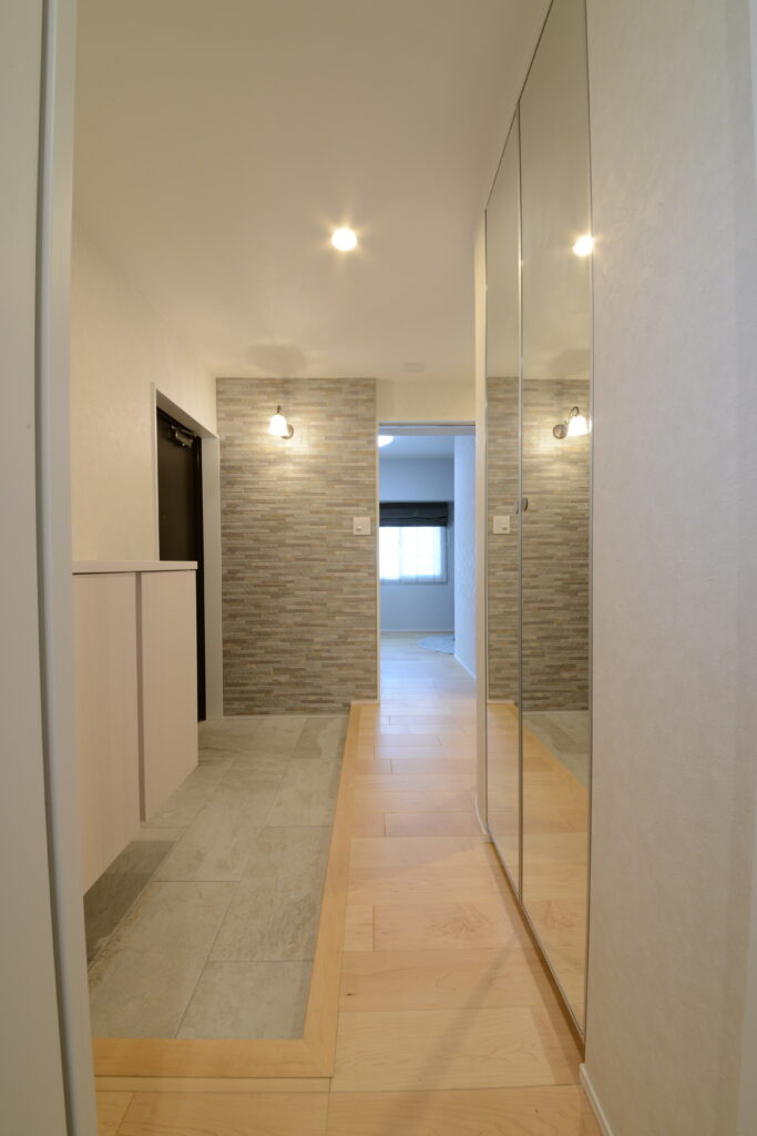 壁材が印象的な憧れの広々玄関土間