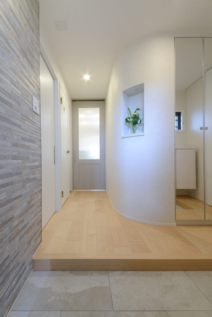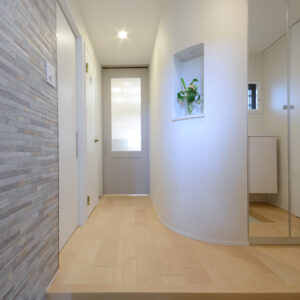 玄関を開けるとアール壁とナチュラルな木の床がお出迎え。 ニッチのグリーンにも癒されます。