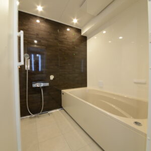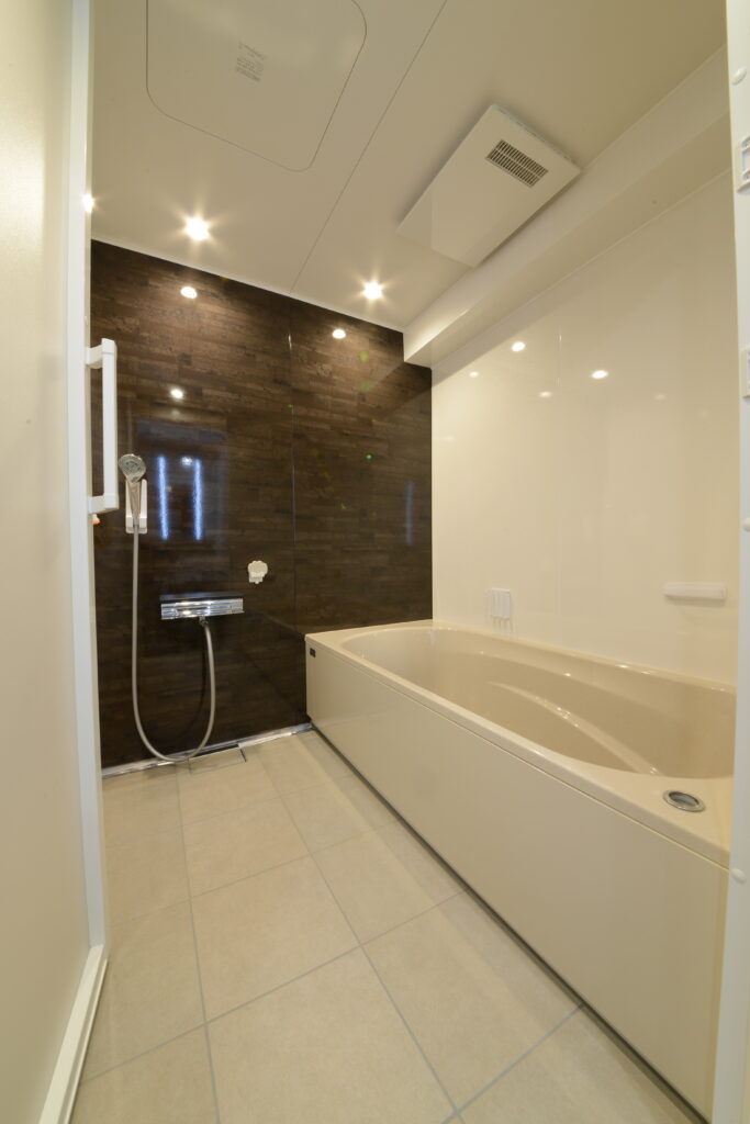 ダークトーンのアクセントパネルが映える、上質感溢れるバスルーム