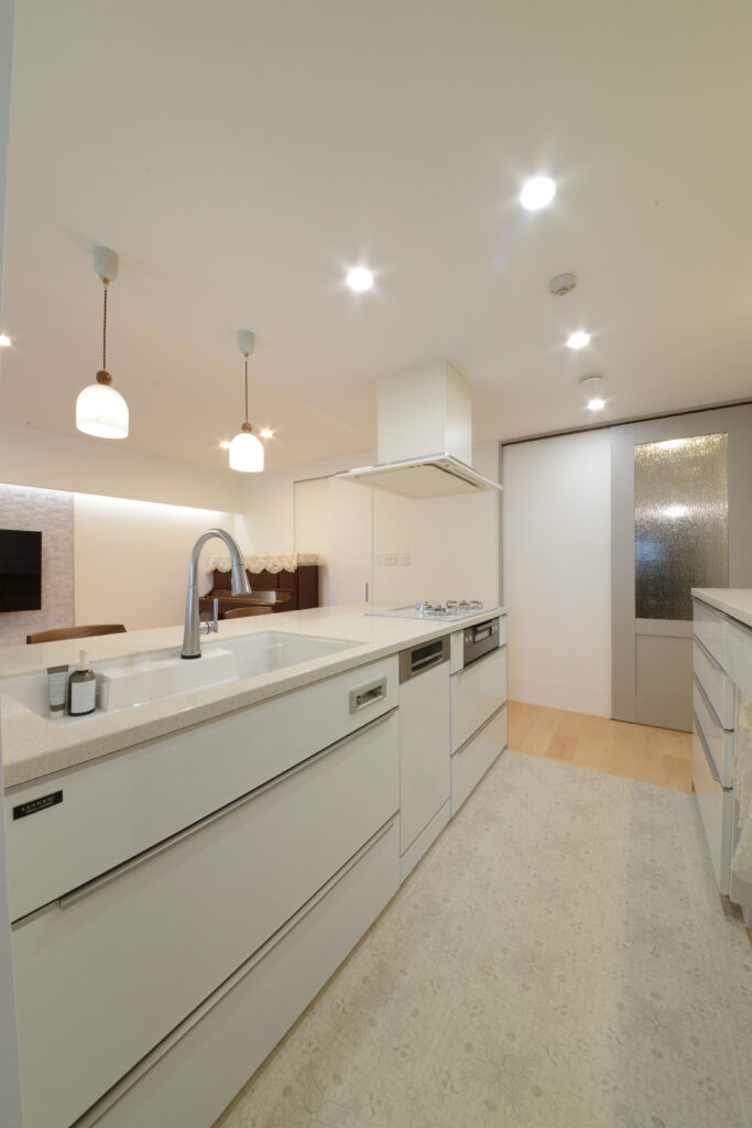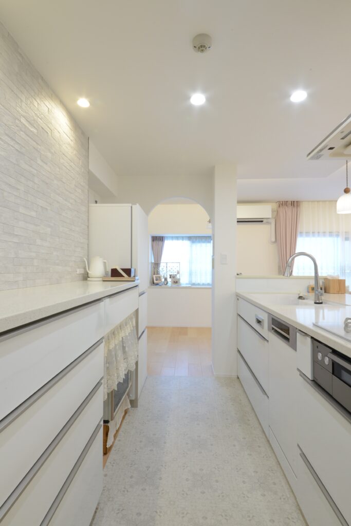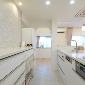 白で統一されたキッチンは、明るく清潔感のある空間に