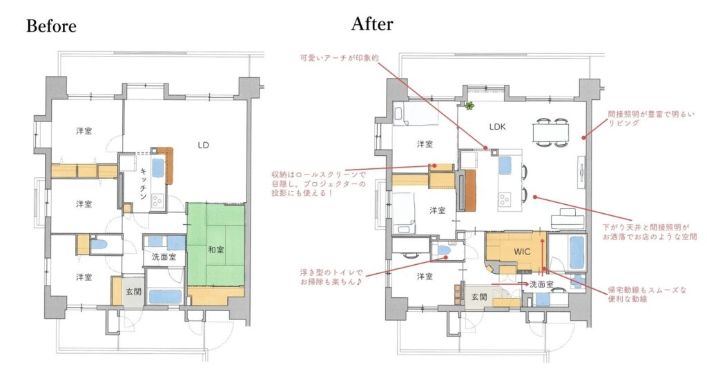 「明るく暮しやすい」をテーマにしたマンションリノベーション。間取りを考える上でのもう一つのテーマは無駄をなくしてシンプル...