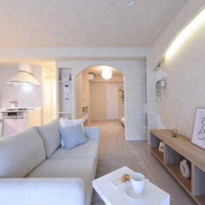 北欧のカフェのような空間で、暮らす家。 LDKにはアーチ開口が2カ所、 キッチンから続くパントリーともう一つは書斎。...