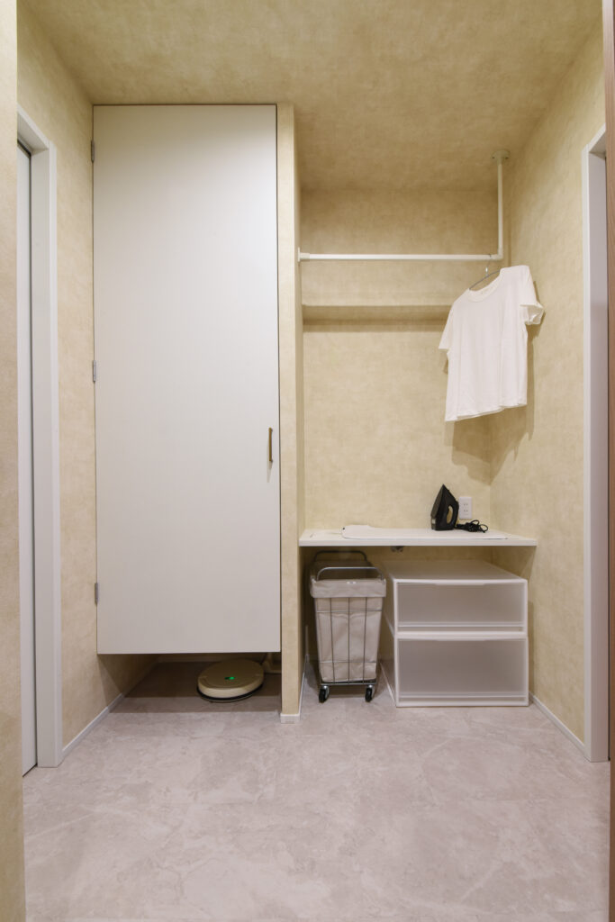 脱いだものはかごに入れて洗濯機へ。動線抜群な作業台